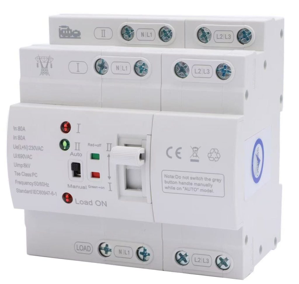 Back to Products Automatic Transfer Switches (ATS) Ensure continuous power operation with PC-class infrequent change-over switches. ATS Type 1Two-station design for main and backup power supply switching. PC-class infrequent change-over switch Rated currents from 6A to 63A Automatic switching within 50ms Prevents power outages ATS Type 2Advanced transfer switch configuration. Suitable for AC 50-60Hz systems Reliable system operation Compact structure
